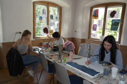 Schon beim Betreten des Schlosshofes wird deutlich, dass sich hier alles um die Kunst dreht. Auf Staffeleien stehen großformatige Leinwände und die Gemälde des Workshops „Abstraktion“ nehmen langsam Gestalt an. „Ich möchte mit meinem Bild das Gefühl von Freiheit und der Freude am Tanz rüberbringen“, erklärt Anna-Sophie Miller. Noch skizziert sie ihr Motiv mit dem Bleistift, aber von den Farben hat sie bereits eine Vorstellung. „Ich möchte einen schwarzen Hintergrund und dann mit Pink und Grün arbeiten.“ Aber das könne sich im Laufe des Prozesses noch verändern, so die junge Künstlerin. Neben ihr arbeite Ilona Szente, die aus Ungarn extra zum Kunstcamp angereist ist. Die eindrucksvolle Augenpartie auf der Leinwand zeigt, dass sie nicht zum ersten Mal mit Farbe und Pinsel tätig ist.